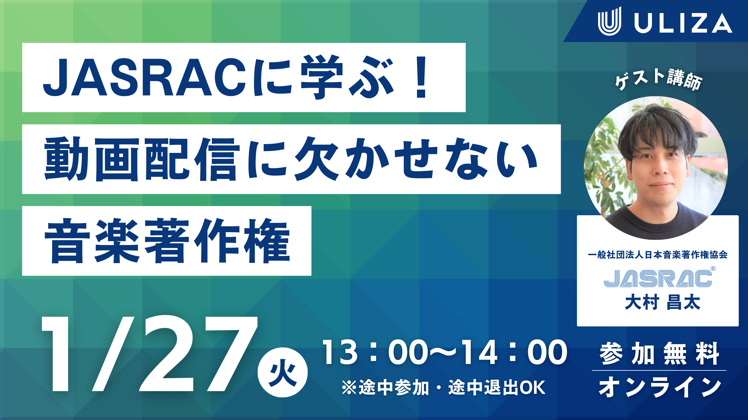 このセミナーで一般社団法人日本音楽著作権協会(JASRAC)の大村 昌太さんをゲストにお招きし、音楽著作権の概要から動画配信で注意したいことまでをご紹介します。